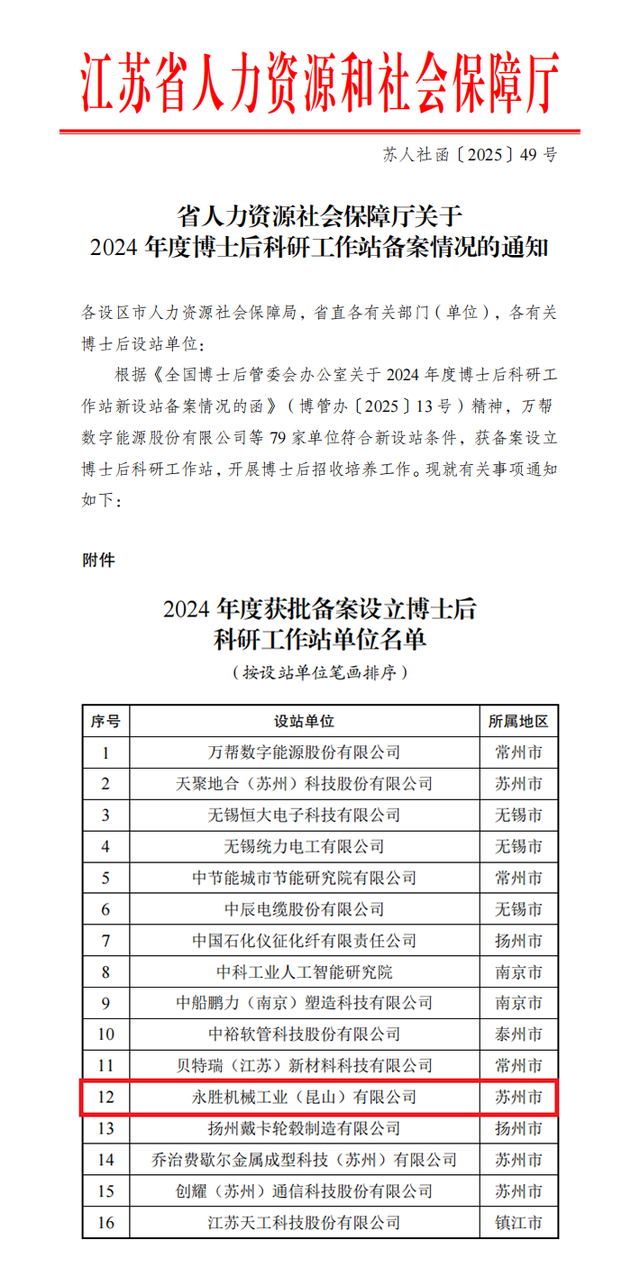 近日,全国博士后管委会办公室公布2024年度获批备案设立博士后科研工作站单位名单,永胜机械工业(昆山)有限公司位列其中,张浦镇国家级博士后科研工作站再添新成员。