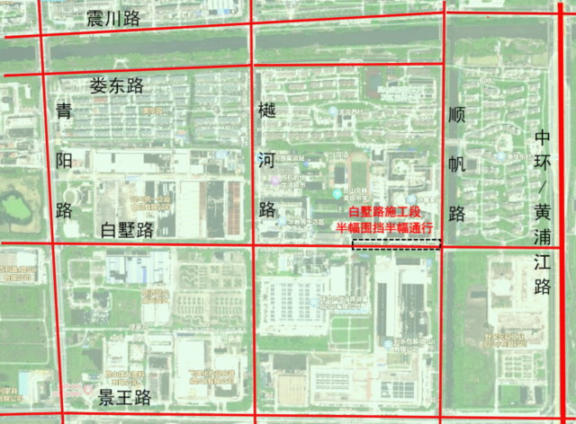 白墅路占用南侧5m宽道路封闭施工,保留9m宽道路保证车辆双向通行。