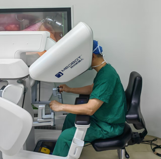 整个手术过程,主刀医生坐在专门的控制台前,头靠在视野框上,双眼接受高清放大的三维立体手术视野图像,以舒适、稳定的姿势控制操作杆,手部动作传达到机械臂的尖端,完成手术操作,从而增加精确性和平稳性。