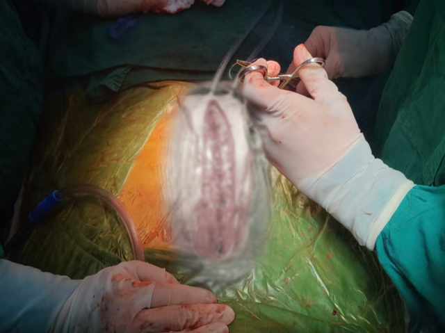 心包剥脱术被称为“在心脏上雕刻”的手术,增厚的心包与心肌粘连紧密,稍有不慎即会损伤冠状动脉或导致心脏破裂。手术团队小心翼翼地切开心包,并在显微镜下精准剥离增厚、钙化的组织,使受困已久的心脏恢复轻盈跳动。患者的中心静脉压由20 cmH₂O降至12 cmH₂O,心脏的血流动力学得到了显著改善。