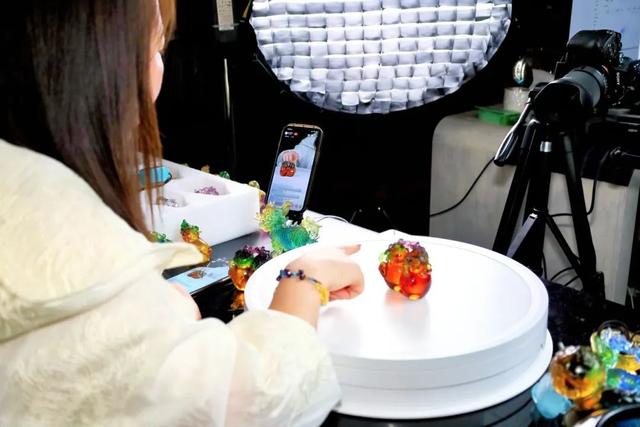 “七号链接是咱们家自主设计的一件产品,既是摆件也是花器,还可以作为笔筒使用,细节感满满……”企业一隅,有一处满是专业设备的直播空间,一场线上琉璃销售直播正在进行中,有不少观众在评论区留言咨询。匠门琉璃不断思考如何让琉璃从“躺在展柜里”的陈列品变成广受欢迎的商品,将千余种产品搬到线上,建成较为完备的电商运营体系和运营团队,获得了良好的经济效益。