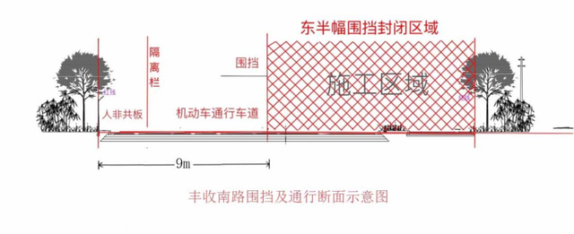 2025年4月18日至2025年5月4日丰收南路东半幅封闭施工。丰收南路西半幅设置双向车道,可正常通行。