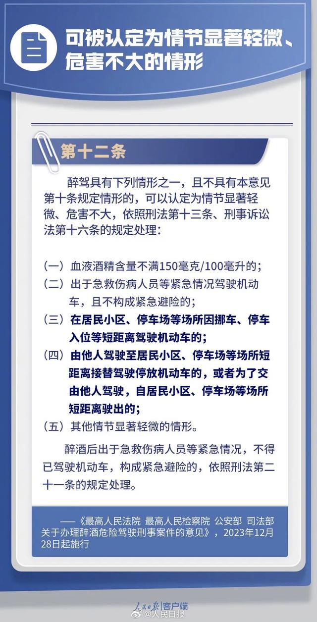 2023年12月13日,最高人民法院、最高人民检察院、公安部、司法部联合印发《关于办理醉酒危险驾驶刑事案件的意见》,该《意见》于同年12月28日起施行。《意见》第十二条规定,为了交由他人驾驶,自居民小区、停车场等场所短距离驶出的,如没有《意见》第十条规定的从重处理情形,可以认定为情节显著轻微、危害不大,不认为是犯罪处理。个别司机以此为由,在未采取实际行动寻找代驾人员的前提下,酒后驾车驶出居民小区或者停车场,被查获后却说是为了方便找代驾,意图逃避法律的制裁,最终被判处刑罚。