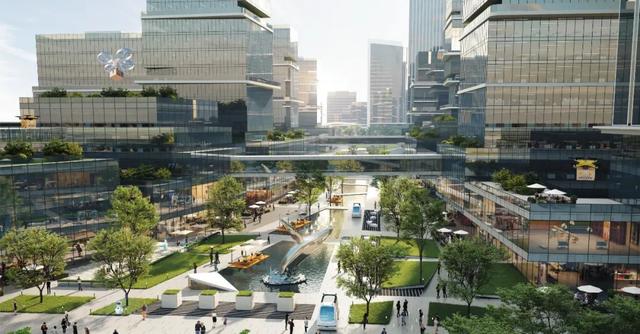 潮流集聚、滨水活力。青阳港中央商务区将利用滨水空间,招引高能级总部经济、数字经济产业,规划共享办公,发展首店经济、夜经济,通过亲水步道、艺术装置,打造沉浸式消费场景。