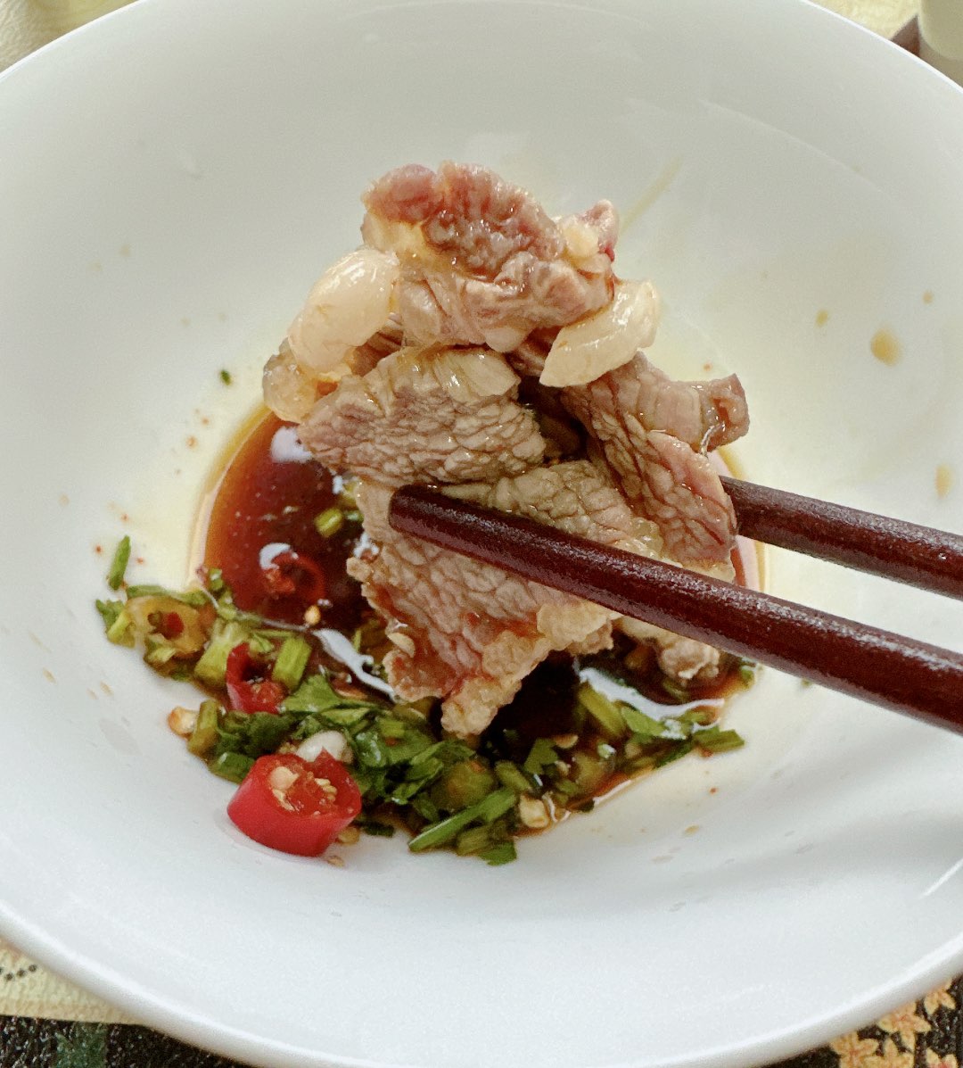 下班前问某人不会今天又中午吃多了,晚上不吃了吧!我准备买点牛肉回家阳台吃个火锅。买了46米的吊龙,还买了一根玉米、一个萝卜半张千张、一颗娃娃菜。抖音上看的牛肉锅底,就玉米和萝卜煮一刻钟捞出来丢掉,然后放几个牛肉丸,再放新的萝卜和玉米煮就好了,切了个土豆和一点贡菜,才发现家里的牛肉丸被好大女吃掉了,我就这么直接玉米萝卜汤底。锅底啥也没放就这么涮了好大儿直接辣椒粉,我和某人吃我调的蘸酱汁,就小米辣、大蒜末、香菜末、芹菜末、头抽、香醋、盐这些。