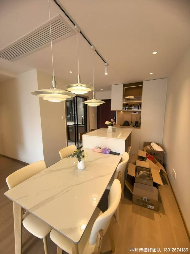 餐厅吊顶嵌入筒灯,搭配餐桌上方的吊灯,与岛台形成一个用餐区 —— 岛台不仅可作为备餐台,还能充当临时吧台,夜晚吊灯亮起,氛围感瞬间拉满。