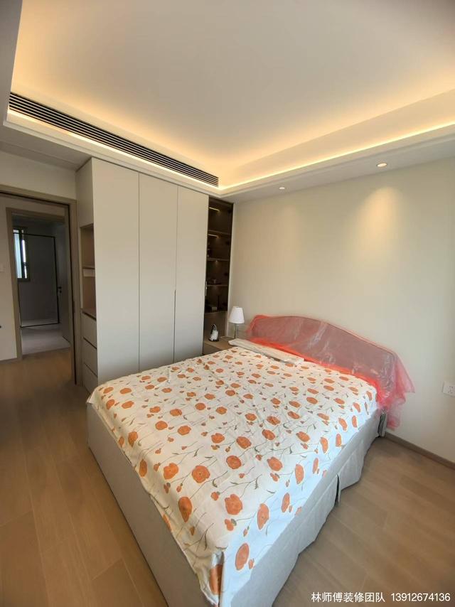 主卧以莫兰迪灰为主色调,移门背后的步入式衣帽间采用 u型布局,定制挂杆与叠放区按衣物尺寸科学划分,1.8 米软包大床搭配同色系床头柜,实用且舒适。
