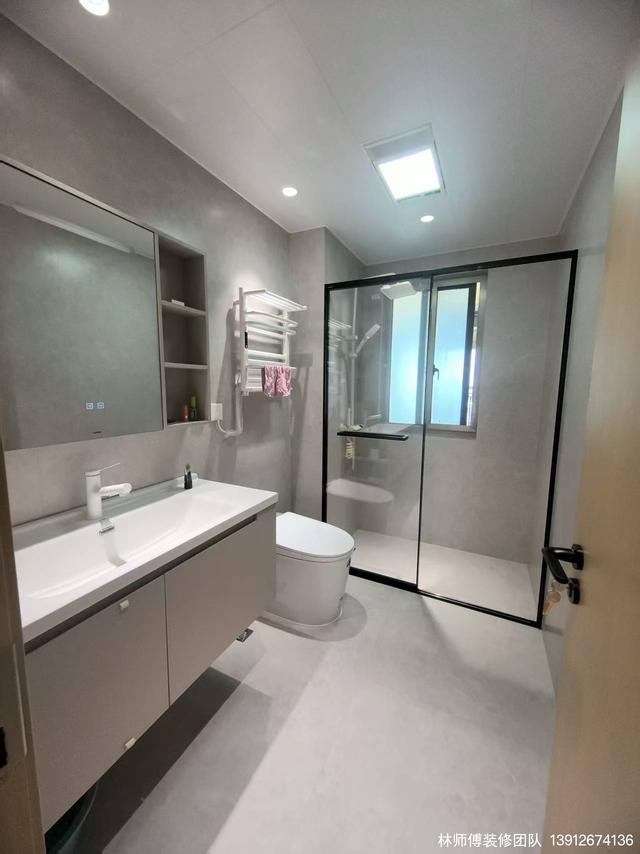洗手间以玻璃隔断实现干湿分离,洗手池上方是镜面柜,镜柜内分层收纳护肤品,侧柜预留吹风机位,底部悬空方便扫地机器人进入。整个设计既实用又提升质感。