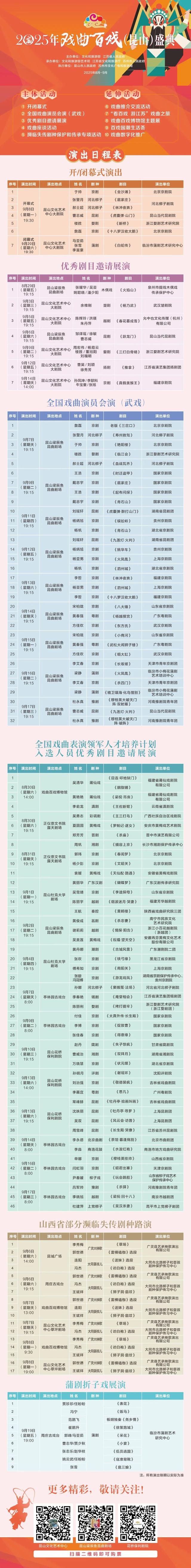秉持“惠民利民”宗旨,本届百戏盛典着力拓展戏曲服务基层、贴近群众的新场景。来自全国31个剧种、53家剧院团的107个剧目将轮番上演,共计39场演出,包括8台大戏、31场折子戏,参演人员超3000人。演出阵容星光熠熠,涵盖36位“文华奖”“梅花奖”“白玉兰奖”得主及众多优秀青年演员,老中青三代同台,行当齐全、文武兼擅,既呈现京剧、越剧、昆曲、扬剧、楚剧、婺剧等观众熟悉的剧种,也特邀山西大同耍孩儿、广灵大秧歌等濒临失传剧种登台。