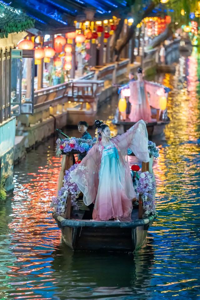 国风演绎不仅限于街头巷尾,古镇的水域也成了天然的舞台。乘坐摇橹船,逐水前行,耳边是轻柔的古筝与琵琶声,眼前是古镇夜景的绝美画卷,让人仿佛置身于一幅流动的水墨画中。