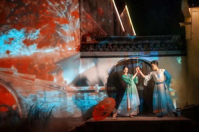 沿着石板街一路向前,走在古镇大大小小的街巷里,还会遇见不一样的惊喜:可能是一副古代谋士装扮的“神算子”,用现代的语言和幽默的方式为游客解疑答惑,带来一阵阵欢声笑语;也可能是邀你对诗的“卖花郎”,他手捧鲜花,口中吟诵着古典诗词,邀请过往的游客参与对诗游戏,让人们在花香与诗意中沉醉,体验了一把古代文人的浪漫情怀;还有可能邂逅各类国风表演,或在绣楼凭栏处,或在古桥拱影下,或在湖畔月色中,曼妙舞姿蹁跹流转,建筑、流水、光影交织成流动的诗篇,演绎着古镇的历史与文化……