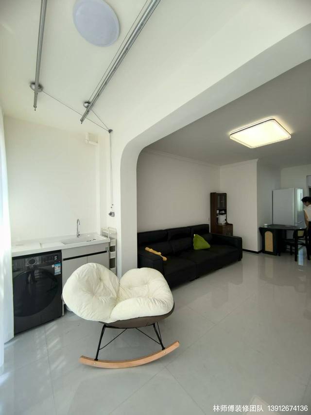 在客厅与阳台的衔接处,打造了一扇拱形门。柔和的拱形线条替代了生硬的直角,成为空间的视觉焦点。客厅没有做复杂背景墙,仅以纯白墙面为基底,下方搭配黑色沙发 —— 黑白对比既突出了视觉层次,又避免了纯白空间的寡淡感,简约中透着精致。