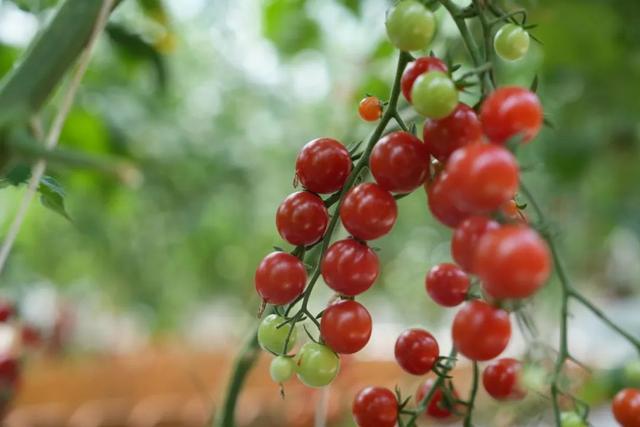 一串串红彤彤、黄澄澄挂满枝头的樱桃番茄,在绿叶的映衬下晶莹剔透,轻咬一口,鲜甜的汁液溢满口腔,让人回味无穷。