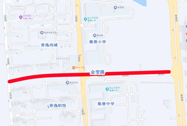 道路位置:连接集善路、远国路、远政路,周边有花桥集善小学、集善中学,以及香逸尚城、香逸铂悦两个小区,为东西走向。