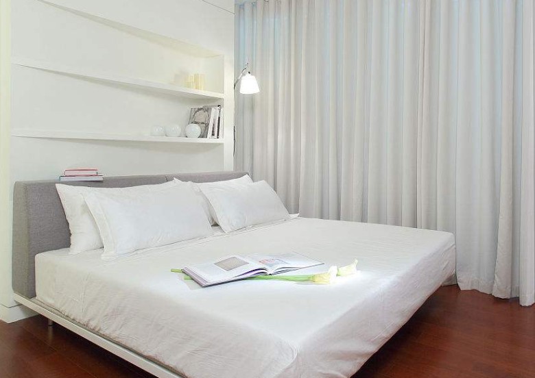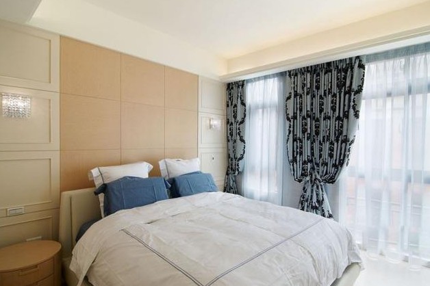 5、风格要统一。功能性保证后,为了美观要把不必要的东西坚决丢弃。同色系、同材质是好选择,并要考虑好摆放的位置。因为小面积卧室的室内空间比较局促,所以过于深、重的颜色会让本就不大的空间显得更小,容易令房间的使用者产生压抑感。所以,适合小面积卧室的颜色虽然有很多,但大都以浅色、高亮度为基本标准。本案例是一个现代简约的小卧室,整体的色彩比较素雅,只有简单的两种色彩,黑与白,米色窗帘。