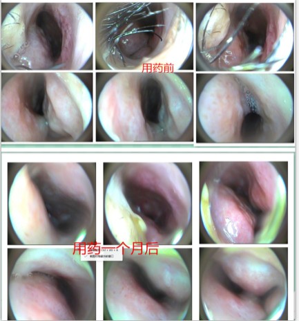 当时我还特意保留了几张我的鼻腔治疗前后的对比图呢,用鼻炎膏前我的鼻腔粘膜有粘连,经常性鼻塞、流鼻涕、打喷嚏,粘膜颜色苍白、溃疡面很大;坚持用了鼻炎膏一个月不到,我的鼻子完全不塞了,粘连部分都打开了,之前所有不舒服的症状都消失了,鼻腔粘膜颜色也红润了很多,鼻炎馆的老师说这是粘膜正在逐步修复过程中,粘膜颜色会越来越红润有光泽的,等鼻腔粘膜功能修复回去后,鼻炎就不会反反复复发作了。