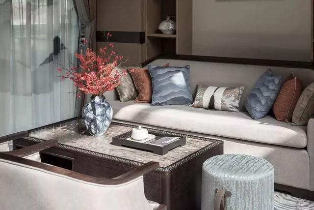 并不是只有大红大紫才能表达新中式的特点,色彩上素雅和谐,在视觉上不会出现大面积饱和鲜艳的色彩,大多以素雅清新的颜色为主,比如白,灰,亚麻色等。使得整个空间更加看起来清爽,通透。