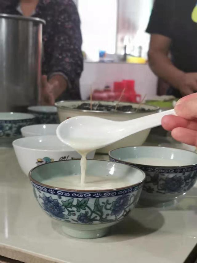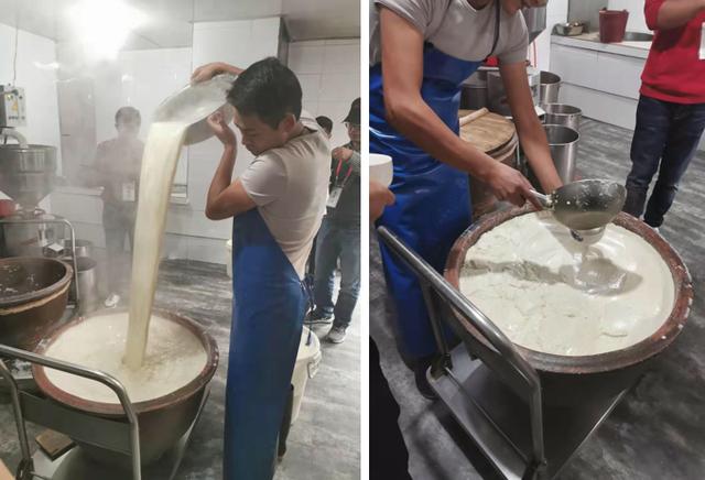 工艺有讲究,必须大铁锅熬制,柴火灶竹片烧制,曾师傅笑称“心急吃不了热豆腐”,铁锅慢熬,夏天需要25分钟,冬天30分钟,这样才能最大程度地发挥豆腐的口感。现场品尝一碗刚刚出炉的豆浆,豆香扑鼻,好不满足!