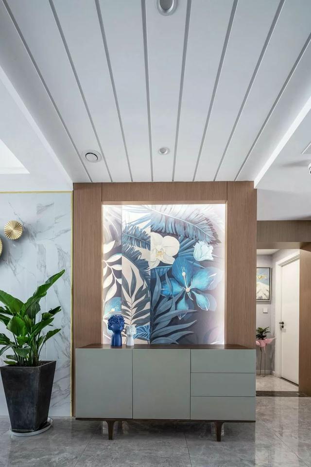 入户玄关巧妙的对客餐厅进行分区,顶面采用石膏板抽缝,视觉上拉伸整体空间。大幅装饰画以木饰边框进行装饰,在灯光的渲染下,更具层次和美感。