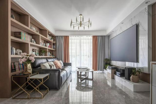 业主两口子都喜欢读书,设计师利用沙发背景打造了整面墙的书柜,书籍和业主收藏的艺术品展示于此。