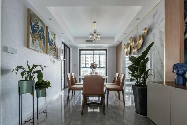 这是餐厅阳台的视角,南北通透。灰色调的墙面搭配金属装饰,起着点缀提亮的作用, 也增添了几分轻奢质感。