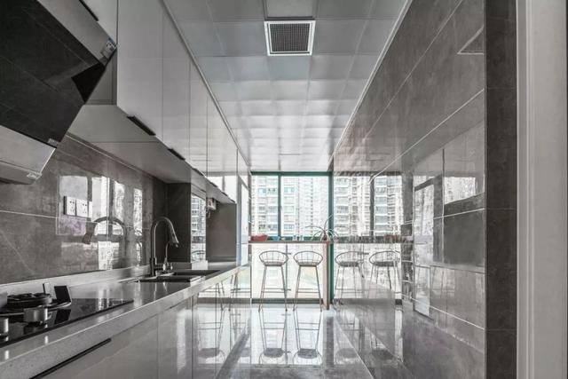 镜面地砖、墙砖及橱柜柜门,视觉上显得更宽敞。靠窗的吧台设计,为下厨增添了很多乐趣。