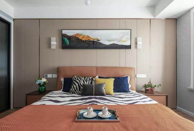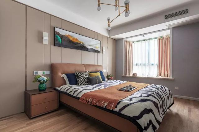 主卧床头背景采用咖色硬包处理,金属线条分割及收口,高级感满满。 背景的装饰画、壁灯、让整个空间更为生动,再加上一束鲜花,一些绿植,增添几分新鲜自然之气。侧面是主卫改造的衣帽间。