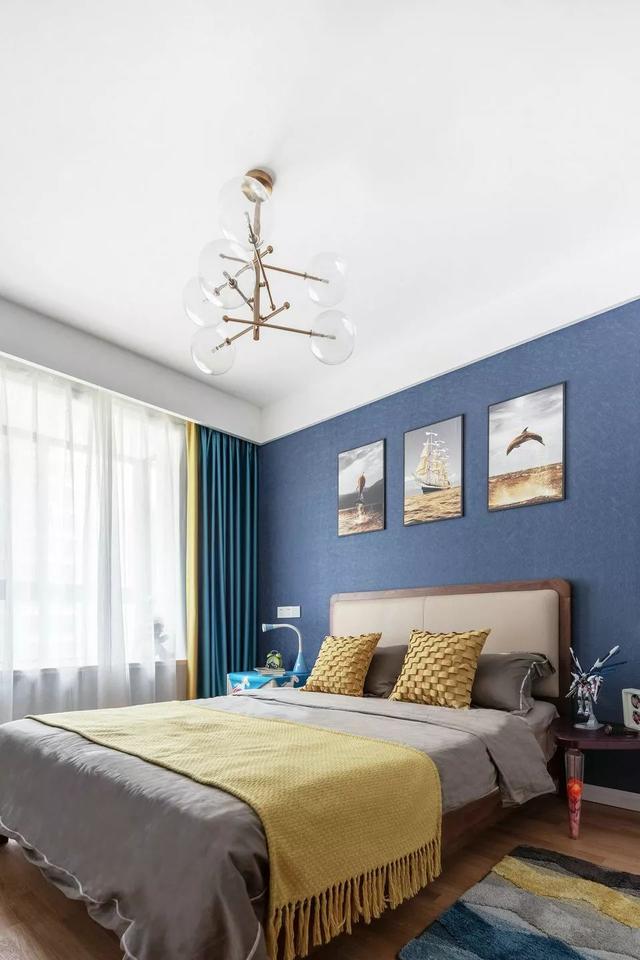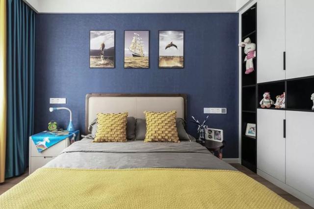 儿童房采用纯净的深蓝色的墙纸作为床头背景搭配纯白和纯黑的衣柜,给人耳目一新的惊喜。