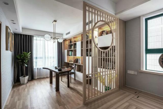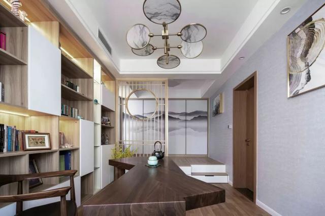 书房的风格偏中式,隔栅、灯饰、装饰画,都充满了中式的传统美感与禅意。整体定制的榻榻米和书柜,平时作为办公和写作业的空间,榻榻米的设计了升降台,作为招待朋友的空间,闲时品一壶好茶。