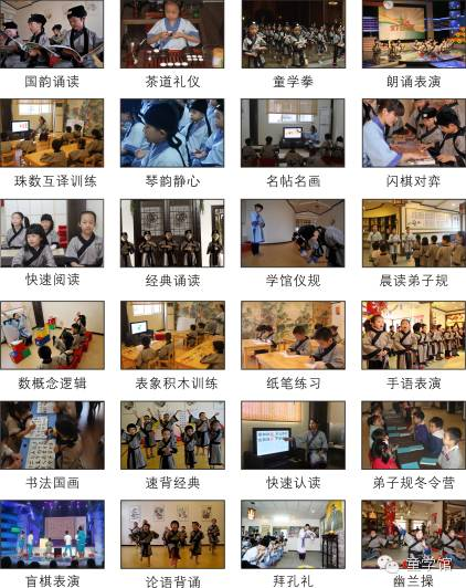 童学馆的课程,主要遵循“中西合璧”的原则,采取“多元阶梯”的课程设计理念,倡导“预存智慧,浸润心灵”的长线教育观,以中西合璧的体验互动式教学法,开发儿童心智潜能,培养君子淑女,打造领袖人才。