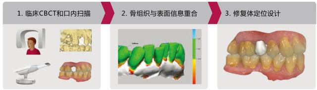 临床CBCT和口内扫描——骨组织与表面信息重合——修复体定位设计——以修复为导向的种植计划——导板与上部修复同步完成——临床种植手术后即刻负重