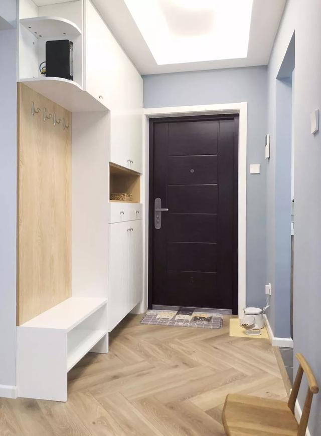 ▲入户玄关处做了到顶的鞋柜,把鞋柜侧方留空作为换鞋凳使用,搭配弧形的转角搁架,看起来更为柔和。木色与白色的结合带来了轻松舒适的感觉。