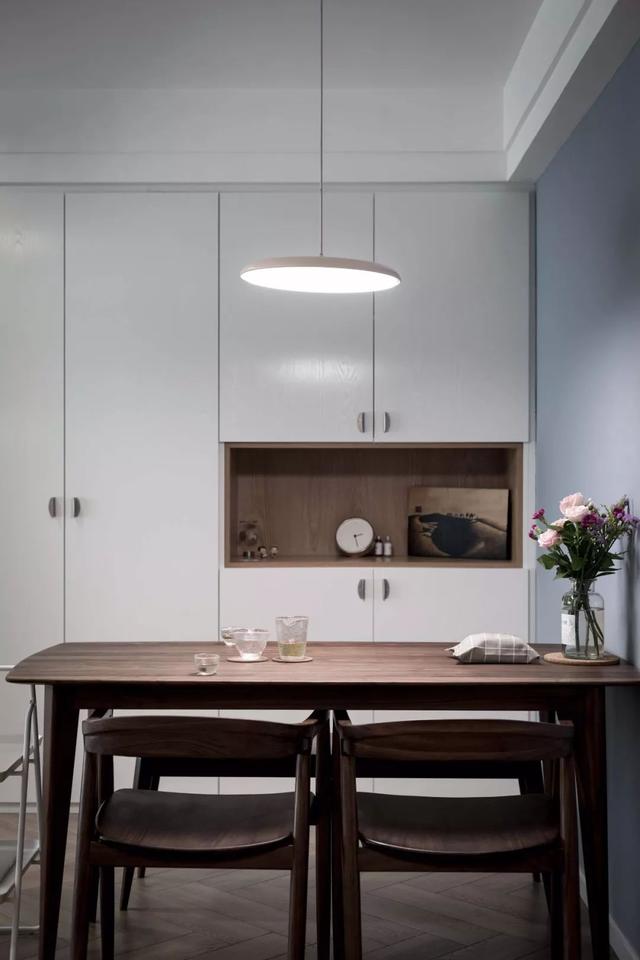 ▲走过玄关就到了餐厅空间,复古的木质餐边柜在蓝色墙面的衬托下,显得更为有格调。餐厅的侧方做了嵌入式的到顶餐边柜,增强了收纳能力。