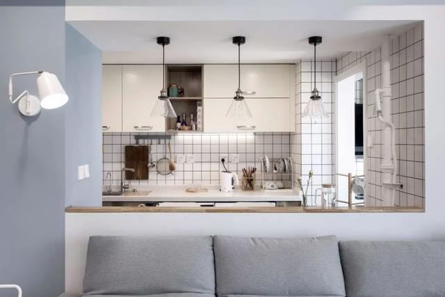 ▲客厅的沙发背景墙和厨房之间做了一个室内窗的造型,把两者连通看起来更加宽敞,这种独特的开放式布局让人感觉格外有趣。