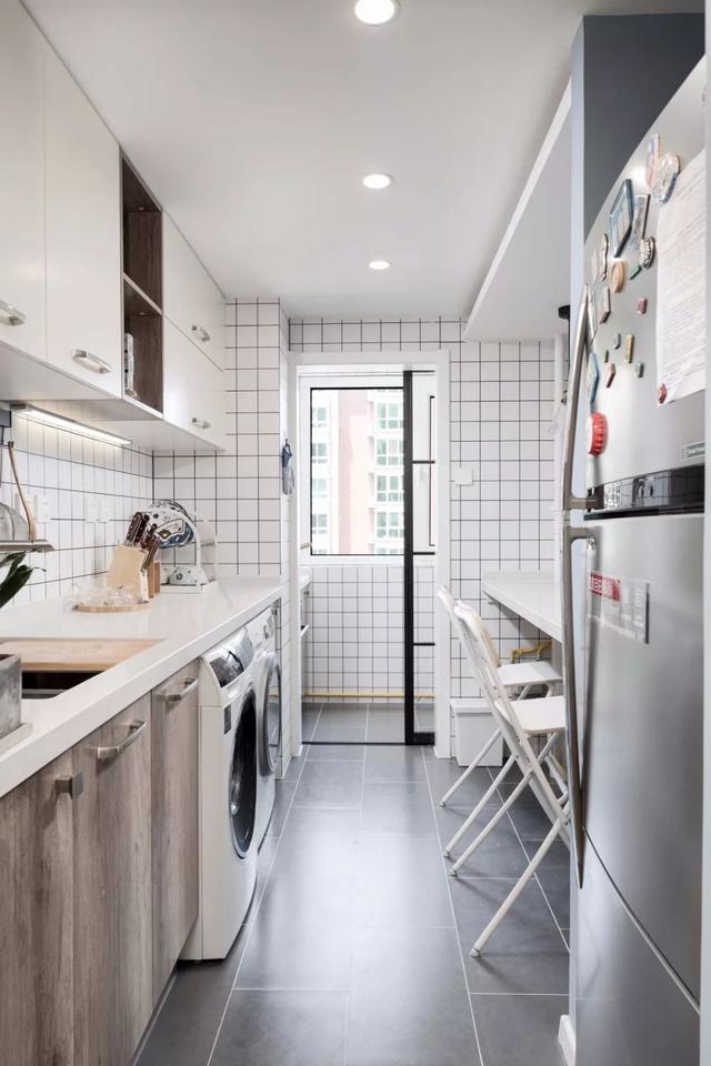 ▲小厨房的灶台是放在了厨房外的小阳台上的,而且加上了玻璃推拉门,所以不会有油烟问题,厨房内部做橱柜、吧台,摆放了冰箱和洗衣机,空间一点都没有浪费。