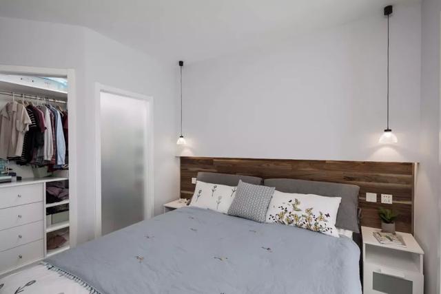 ▲主卧室的衣柜被改成了一个步入式的衣帽间,加上磨砂玻璃门看起来更为时尚。床头做了木质护墙板,让卧室看起来层次分明。