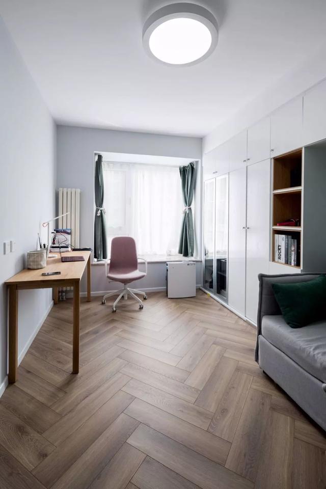 ▲次卧是暂时是作为一个书房来使用,靠着墙面摆放一个轻便的书桌,地面的木地板做人字拼的设计,让书房看起来更加宽敞。