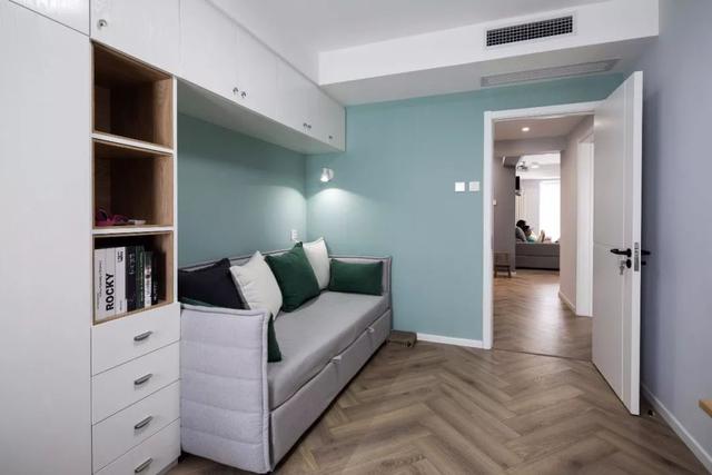 ▲在柜子的下方摆放一个沙发床,这样家里来客人了也可以有个睡觉的地方。床嵌入部分到柜子当中也可以节约出一些空间来。