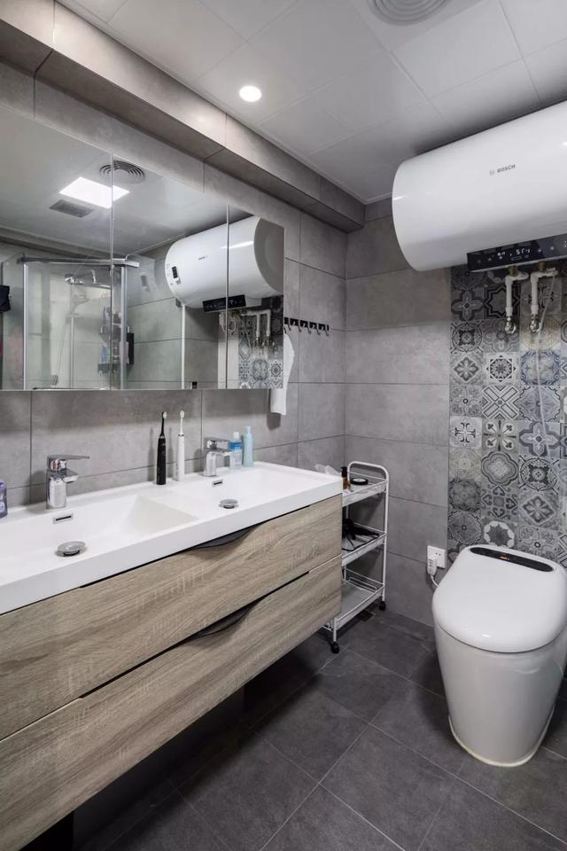 ▲卫生间内部的空间是比较宽敞的,在转角的地方做了钻石型的淋浴房。浴室柜处做了双台盆的设计,让日常使用变得更加方便。