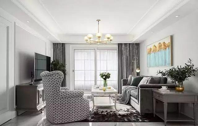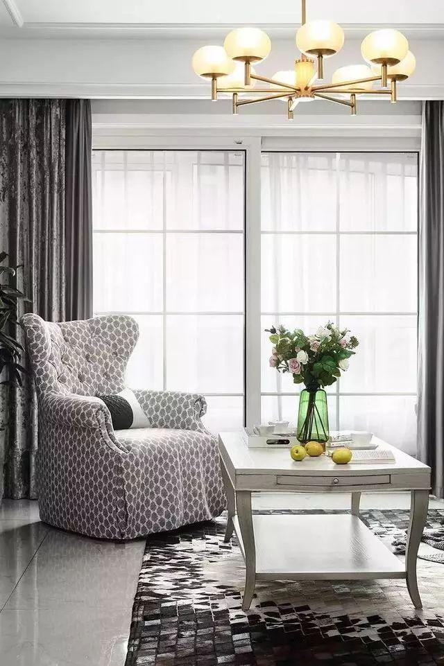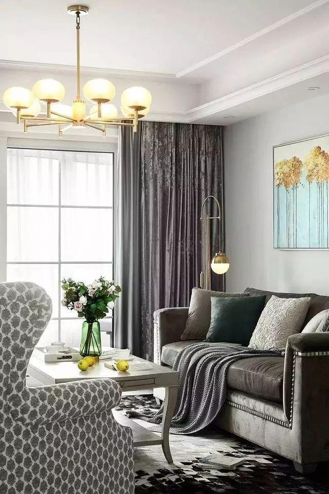 丝绒美式三人沙发与窗帘的材质,有响应的效果,低调内敛,却又流露出一种高贵优雅的气质。金色吊灯与落地灯有锦上添花的效果。