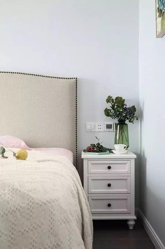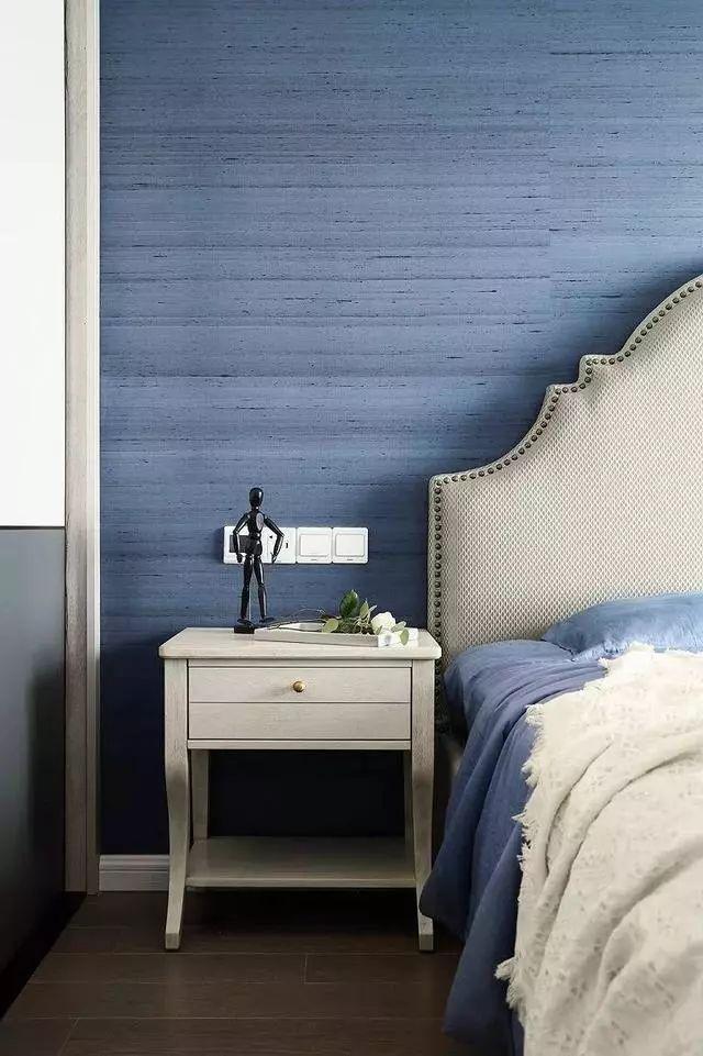 主卧蓝色与白色的搭配,美式铆钉床头,轻柔舒适的床上用品,整体优雅尊贵,休闲舒适兼具。