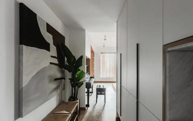 入户玄关右侧靠墙定制了一面墙收纳柜,白色柜门搭配黑色线性的拉手,简约时尚大气。左侧放置了换鞋凳,藤编材质,自然复古。