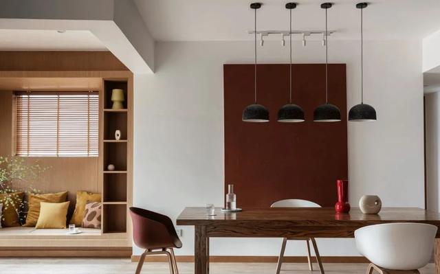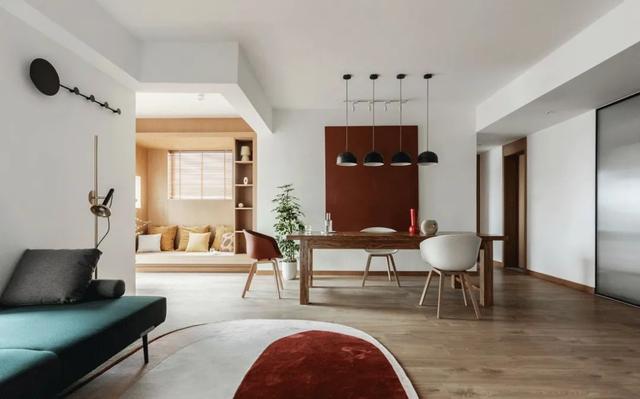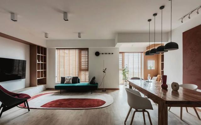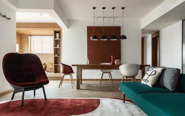 胭脂色与浅棕黄撞色的地毯恰好将客厅的整体色调增加了浓重的感性意味,而来自HAY的单人沙发椅不仅极富设计感,色彩是更深一些的胭脂色,耐人寻味。