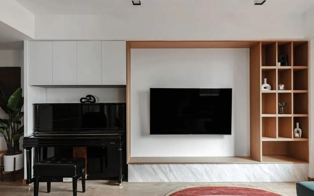 电视墙留出一部分空间摆放钢琴,还做了吊柜,以丰富空间收纳。