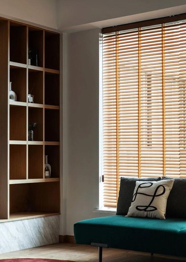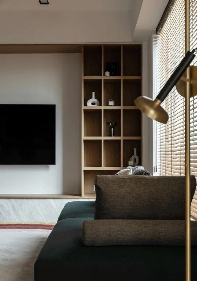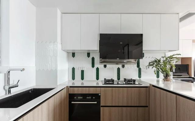 只在墙面上花了点小心机,墨绿和茶白的瓷砖几何异形拼接,多了一丝灵动和巧思,也呼应了客厅的沙发。