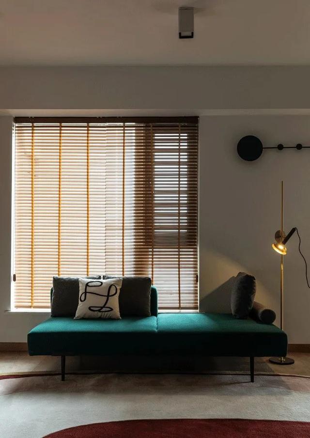 墨绿色沙发雕塑感十足,搭配抽象音符的黑白抱枕,无限延伸空间韵律。