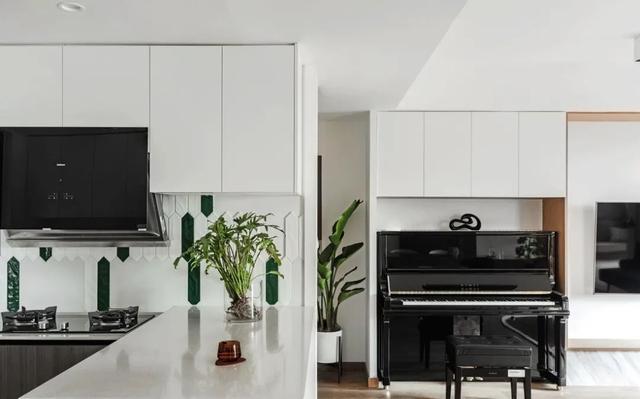 延续钢琴的黑白色调,厨房在灶具烟机和橱柜台面的选择上,都刻意去贴合这样的黑白韵律。