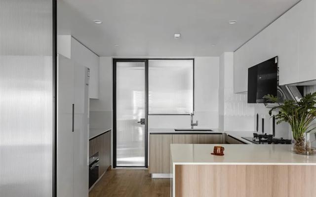 为了让整个空间更连贯,拆掉了厨房与客厅之间的隔墙,进而做了很窄且精致的一扇磨砂玻璃隔断,黑色边框,让冰箱放置在此处不不会显得突兀,也延续整个厅堂的节奏感。