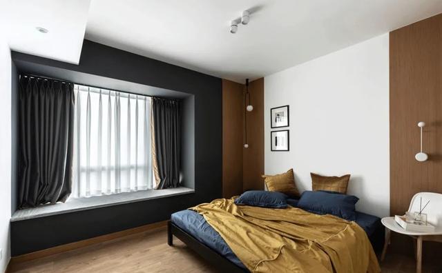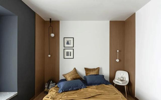 炭灰色、茶白色的漆,碰撞极具质感的木质转角墙面,两幅小小的抽象画,两盏另类别致的床头灯,一上一下,一黑一白,这种有所保留与克制的美感,却充满了坦荡的意味。