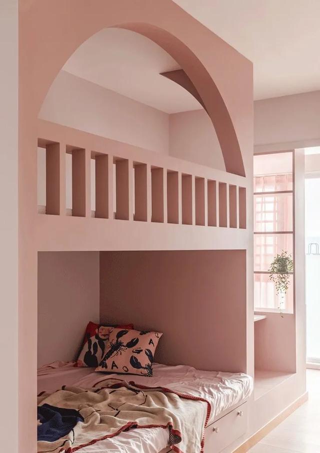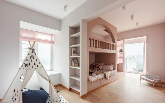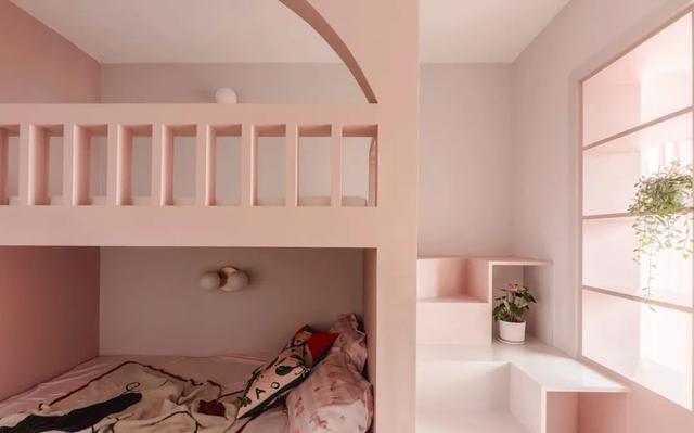 粉色调的公主房,不同的粉融合在一起,并不甜腻,反而因为解构主义,多了一丝理性之美。落地窗让这个儿童房采光极佳,阳光就是主角。